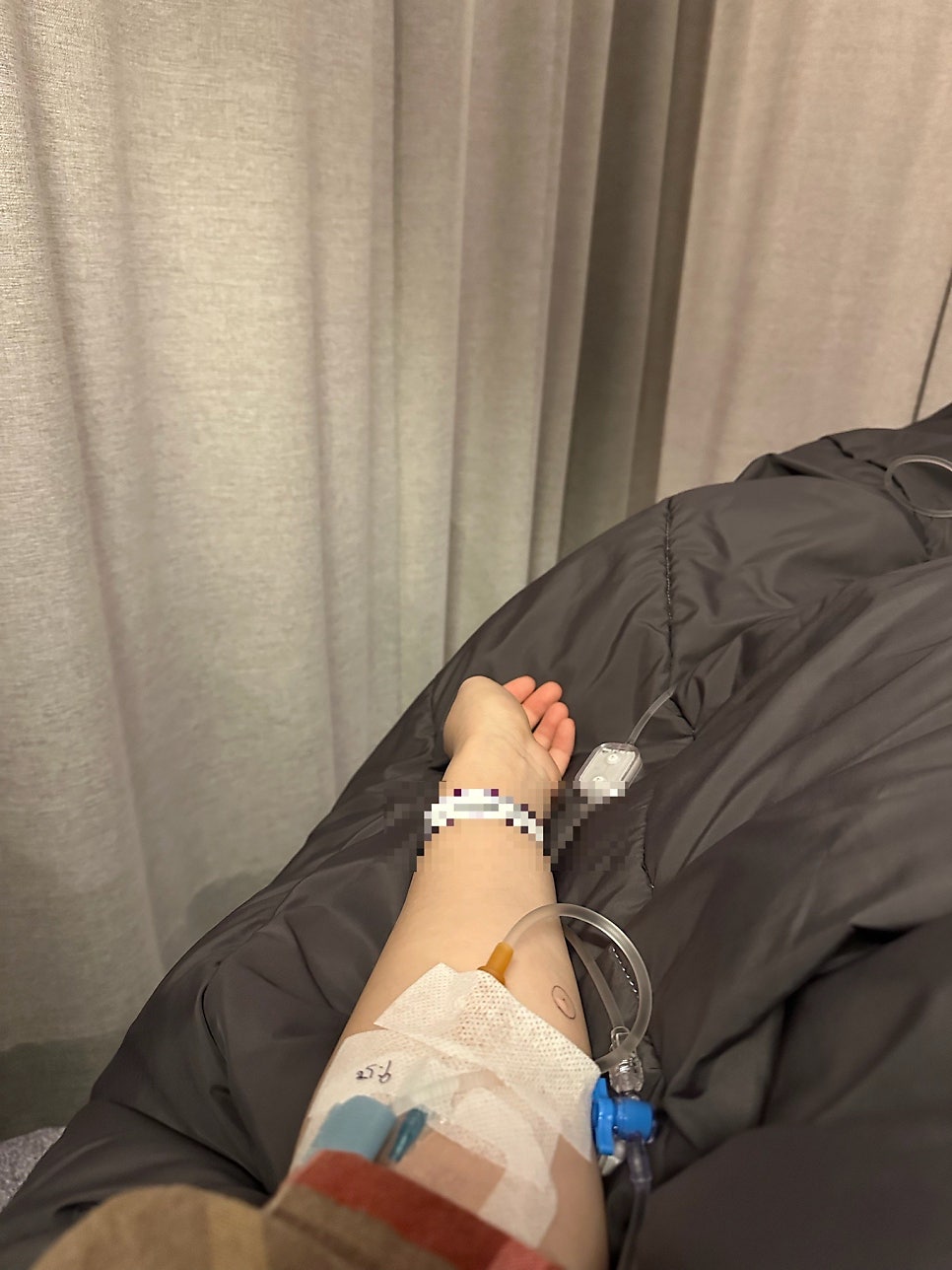 남편은 정자 채취를 위해 개인만의 공간으로 들어갔고, 나는 시술실로 갔다. 상하의를 모두 탈의하고 가운으로 갈아입는 후, 침대에 누워 대기했다. 간호사선생님이 팔에 링거를 꽂아줬다. 내 인생 두 번째 수액이었다. 엉덩이에는 항생제 주사를 놔줬고 팔뚝에 이상반응 없는 걸 확인하고 링거를 통해서도 주입했다.