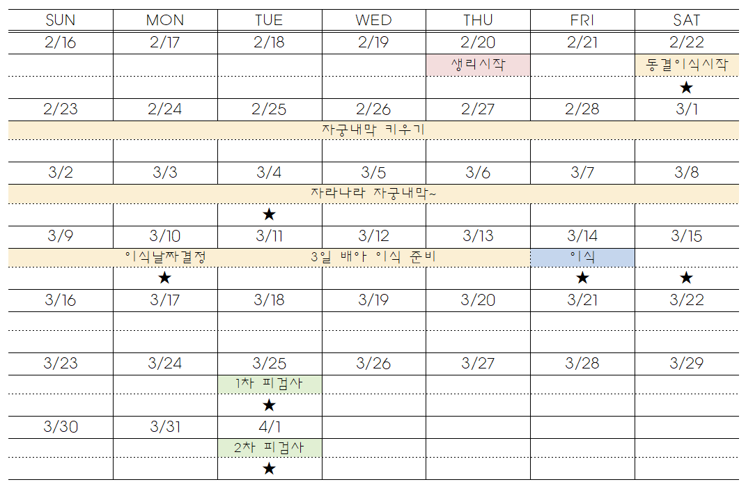 별표한 날이 병원에 방문한 날짜이다. 약 5주 동안 7번 정도 방문했다. 원래 3/4에 이식 날짜를 정하기로 했는데 자궁내막이 생각보다 더디게 자라서 3/10에 방문해서 이식 날짜를 정했다. 3/14 이식 후 프게 수치가 낮아서 다음날 급하게 병원에 방문하기도 했다. 그래도 저번 차수보다는 비교적 병원 방문 횟수가 적은 편인 것 같다.