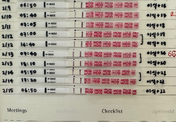 토요일 아침, 여느 때와 다름 없이 임신테스트기에 소변을 묻히고 나서 질정을 넣었다. 나중에 확인하니 임신테스트기가 엄청 흐렸다. 3차 피검사 때보다 흐린 것 같다. 또 불량인가? 어차피 곧 피검사를 하니까 더 정확한 결과를 알 수 있겠지 생각하며 남편과 병원으로 향했다.
