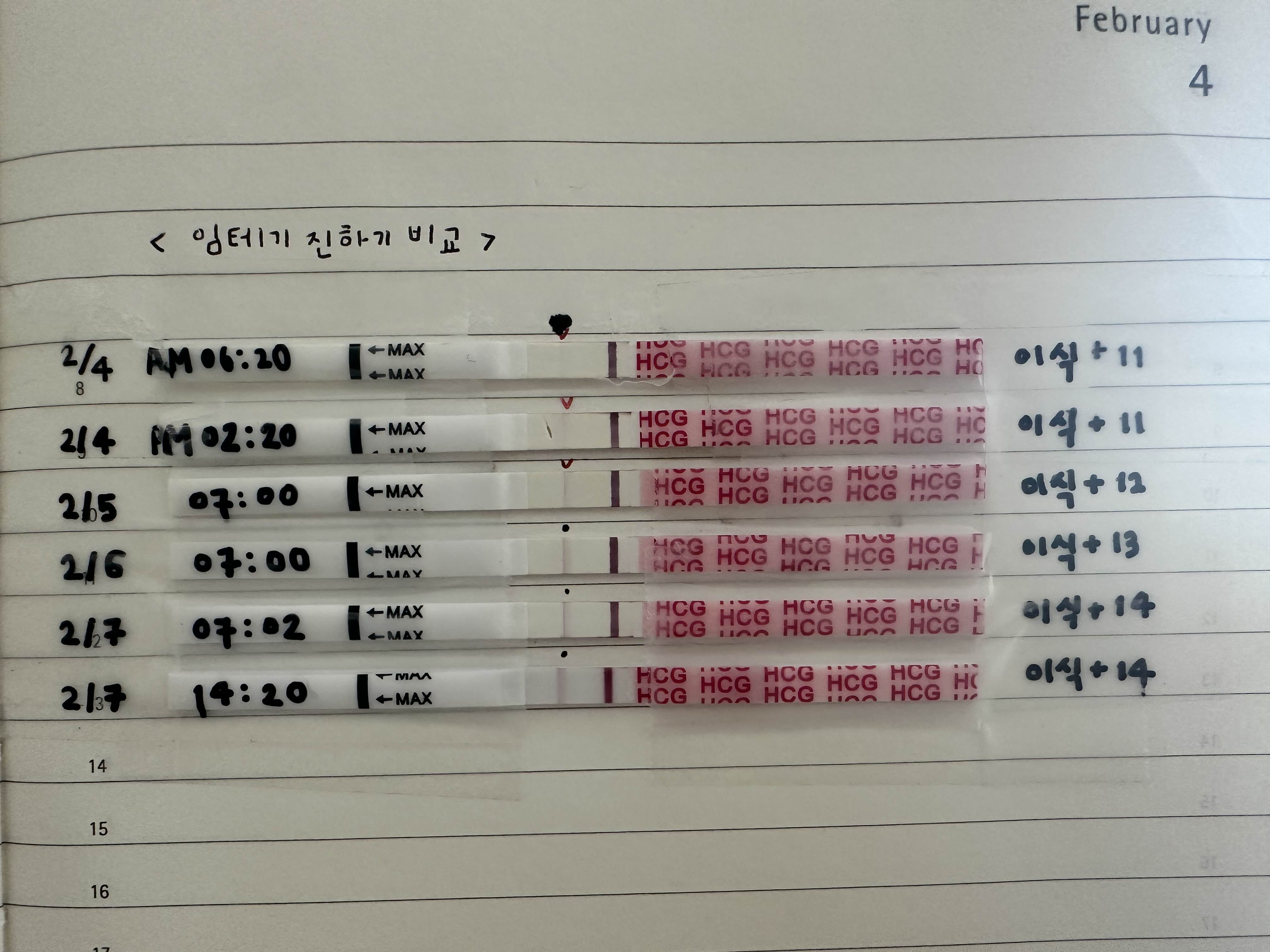 첫 두 줄을 보고 나서 계속해서 임신테스트기를 하며 진하기를 비교하고 있다. 다른 사람들보다 느리긴 하지만 조금씩 진해지고 있는 것 같은데, 여전히 흐린 것 같아서 걱정이다. 이쯤 되면 다들 소변에 닿자마자 두 줄이 뜬다던데 나는 아직도 서서히 진해지고 있다.